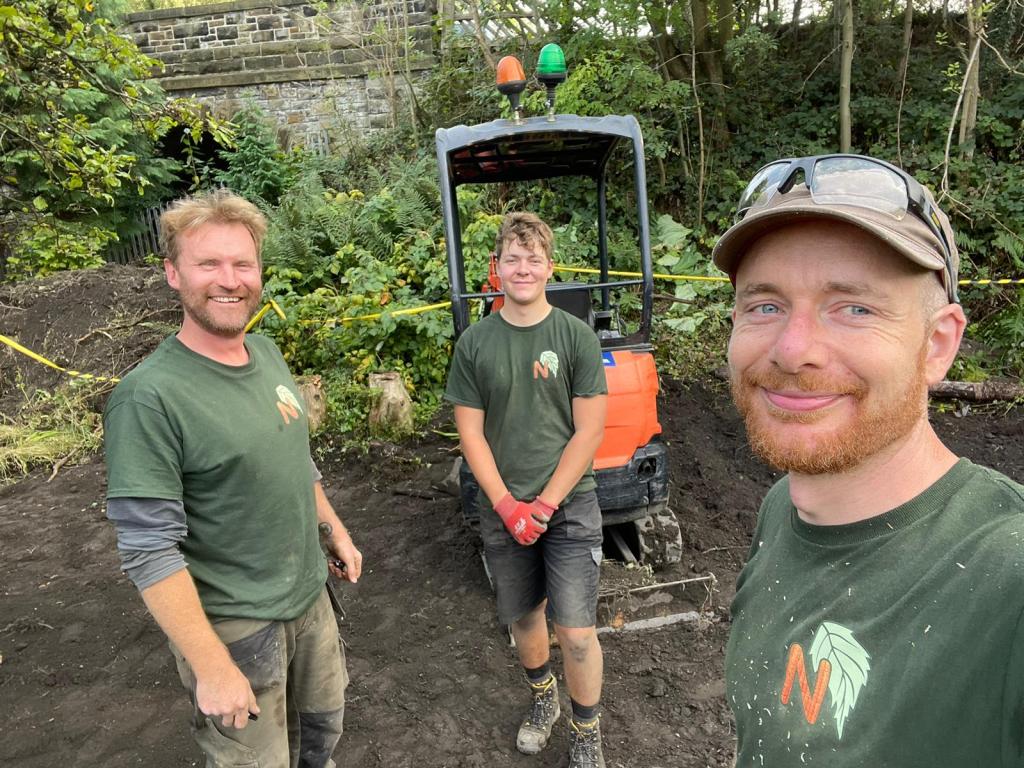 A happy team at the end of a productive first day on the new site! We are aiming this week to put in a beautiful new lawn. This will require levelling the ground, which Stu (left) crushed today on the digger – spot the massive pile in the back left of the photo. First thing tomorrow is to remove the two tree stumps between Alex (centre) and Stu – Alex had a go attacking the roots with the axe but has some way to go before he is skilled enough with the tool to become a fireman. Then we will need to Rotavator the soil, before tamping the soil down ‘riverdance style’ (Sam’s (right) own words). Eventually we will be able to place the turf down in rows, giving those tell tale stripes. The edges will need to be meshed together, and final touches put in. Here is hoping the weather holds for the aesthetic shots at the end of the week ☺